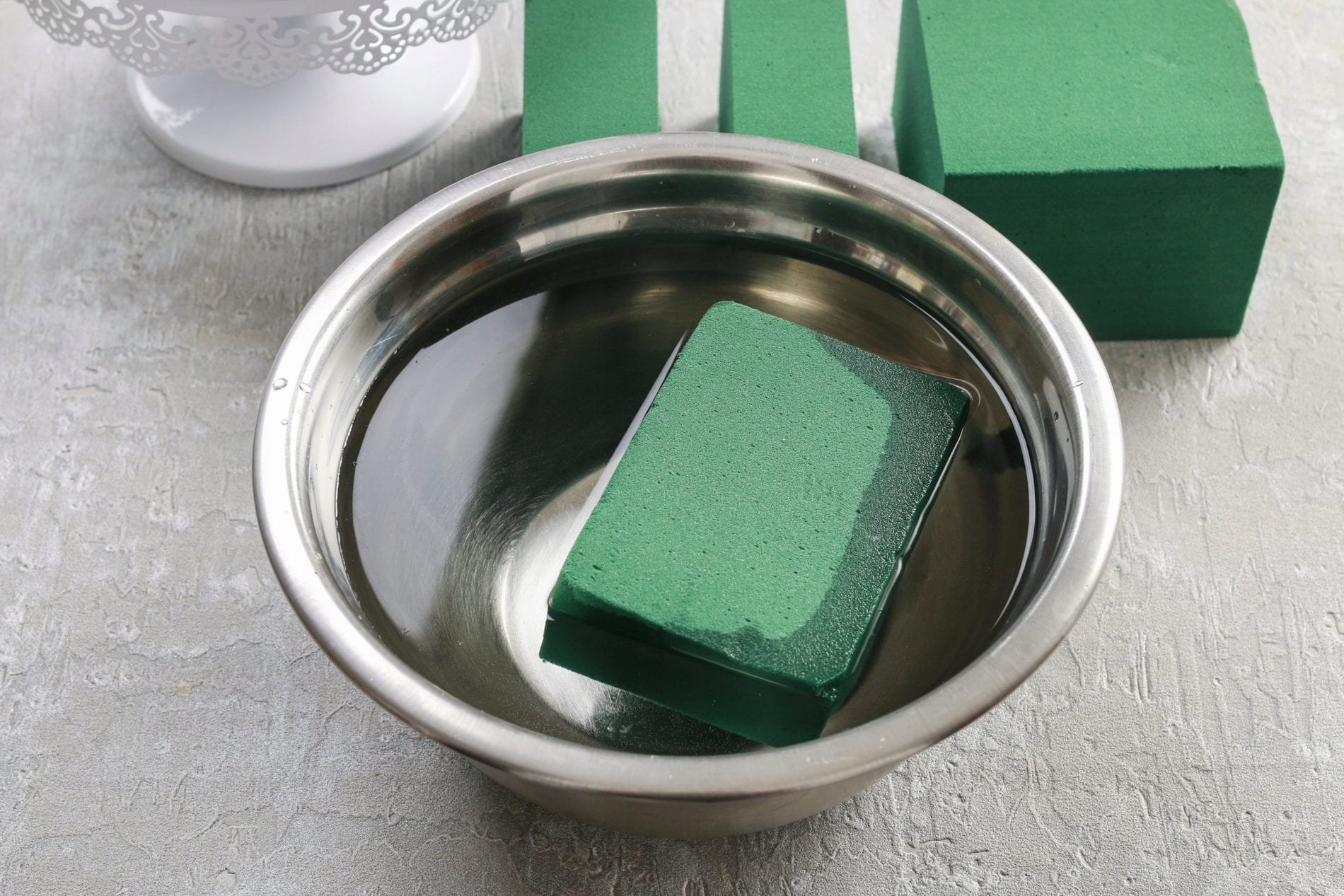 Прежде чем уложить композицию, такая губка должна быть пропитана в воде раньше. Для этого вам нужно налить воду в блюдо, затем положить губку сверху и подождать, пока она свободно не упадет в нижнюю часть