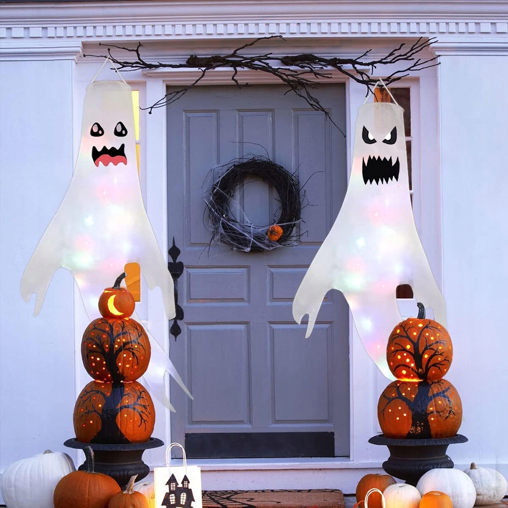 Улучшите свой декор на Хэллоуин с помощью наших ветроуказателей-призраков! Очаровательные и пугающие выражения лица представлены в двух дизайнах размером примерно 50 x 119 см каждый, что создает эффектный внешний вид.