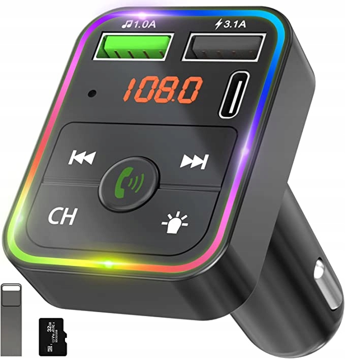 - 7-цветная светодиодная подсветка. Этот адаптер Bluetooth для автомобильного радио поддерживает 7-цветную светодиодную подсветку, красочный свет для создания музыкальной атмосферы. Это также облегчает управление и безопасное вождение при движении в ночное время. Светодиодную подсветку можно отключить.