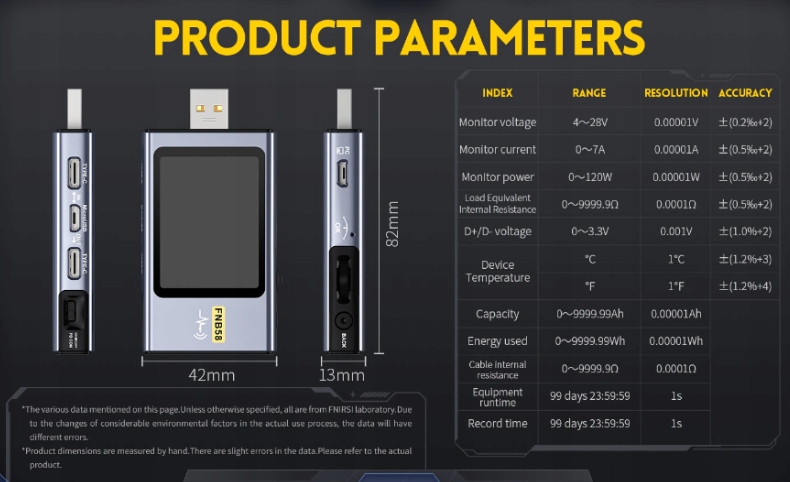 Fnirsi Fn58 -это многопрофильный счетчик электрических параметров USB, предлагающих широкий диапазон измерений и высокую точность. Кроме того, он имеет встроенный детектор и выпускает режимы быстрого зарядки для тестирования USB -устройств. Большой цветовой дисплей позволяет легко работать с Fnirsi Fn58 -метром. USB -счетчик работает с программным обеспечением ПК, где отправляются данные о измерении
