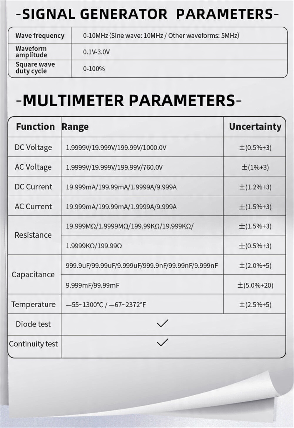 - Тип сигнала: синусоидальная волна, прямоугольная волна, пилообразная волна, полуволна, полная волна, положительная ступенчатая волна, отрицательная ступенчатая волна, сигнал постоянного тока, экспоненциальный рост, экспоненциальный спад, мультиаудио и синхронизирующий импульс.