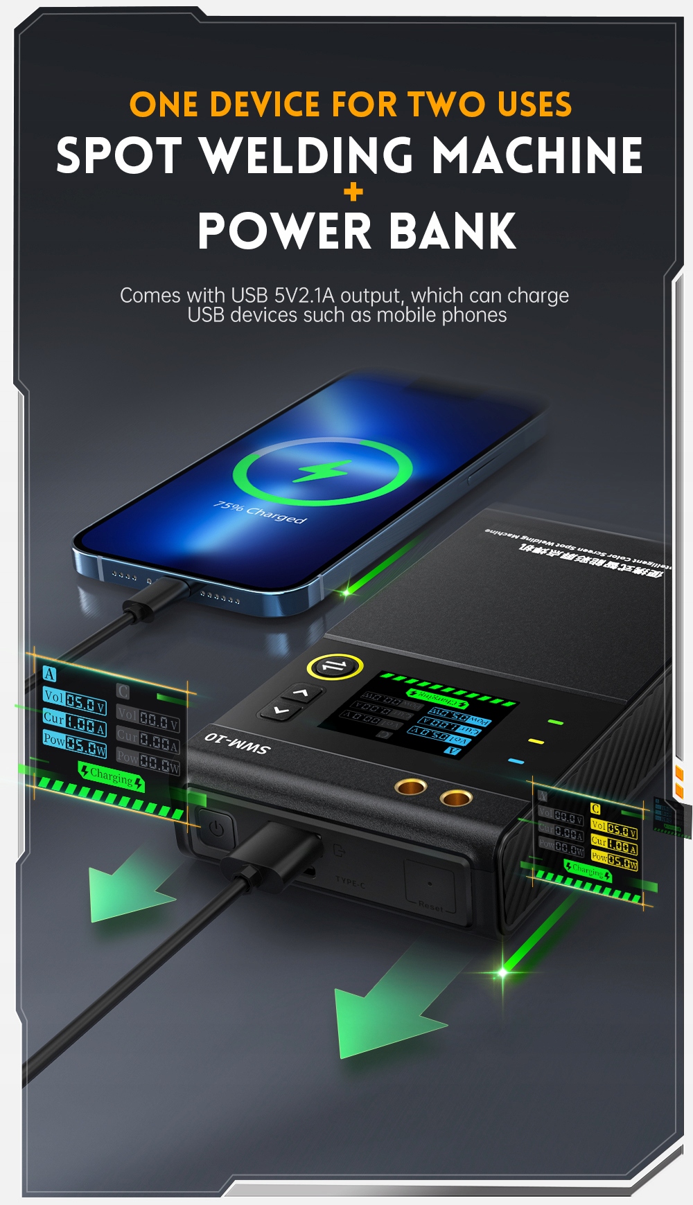 Портативный ручной аппарат для точечной сваркиSWM-10 — эффективный, удобный и легкий в переноске инструмент. Используемая технология точечной сварки двойным импульсом делает сварку более стабильной и долговечной, а также имеет функцию Power Bank.