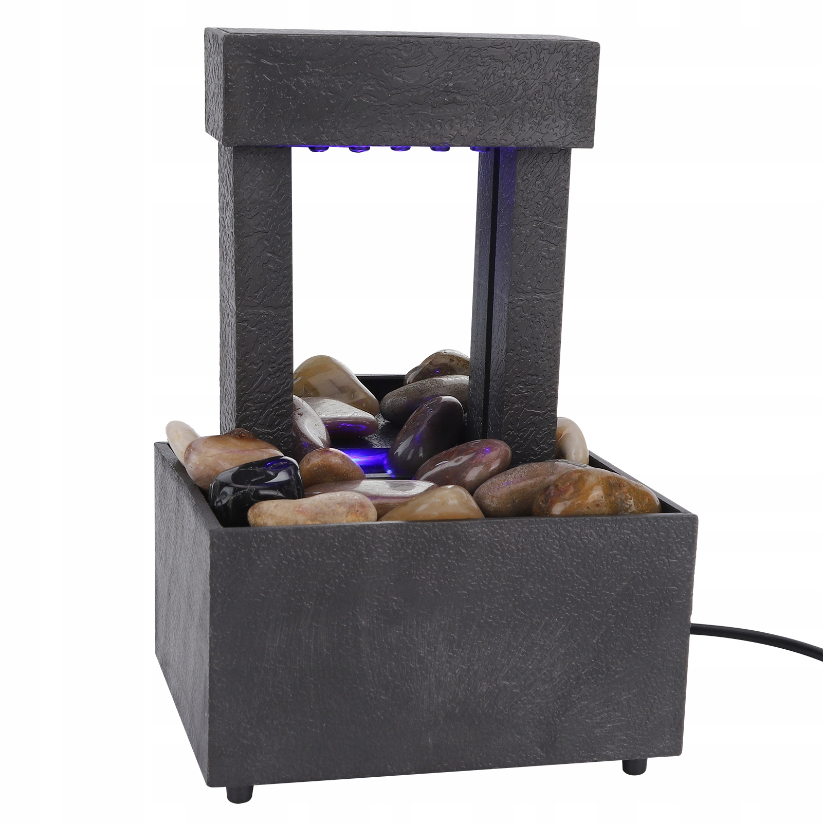 2. Фонтан украшен речными камнями, что придает ему более естественный вид, и светодиодными фонарями, которые освещают воду, придавая ей спокойное сияние.