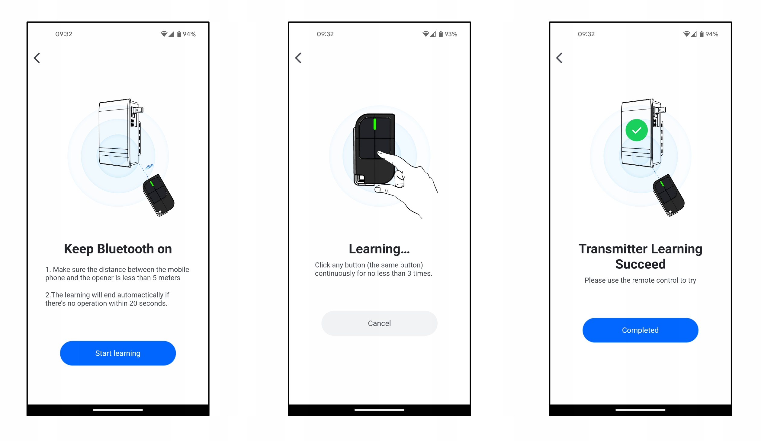 Просто включите обучение приемника с помощью приложения, а затем поднесите пульт дистанционного управления к устройству открывания гаражных ворот. Не забудьте включить Bluetooth. Затем нажмите кнопку на пульте 3 раза. Приложение сообщит вам, что пульт успешно загружен.