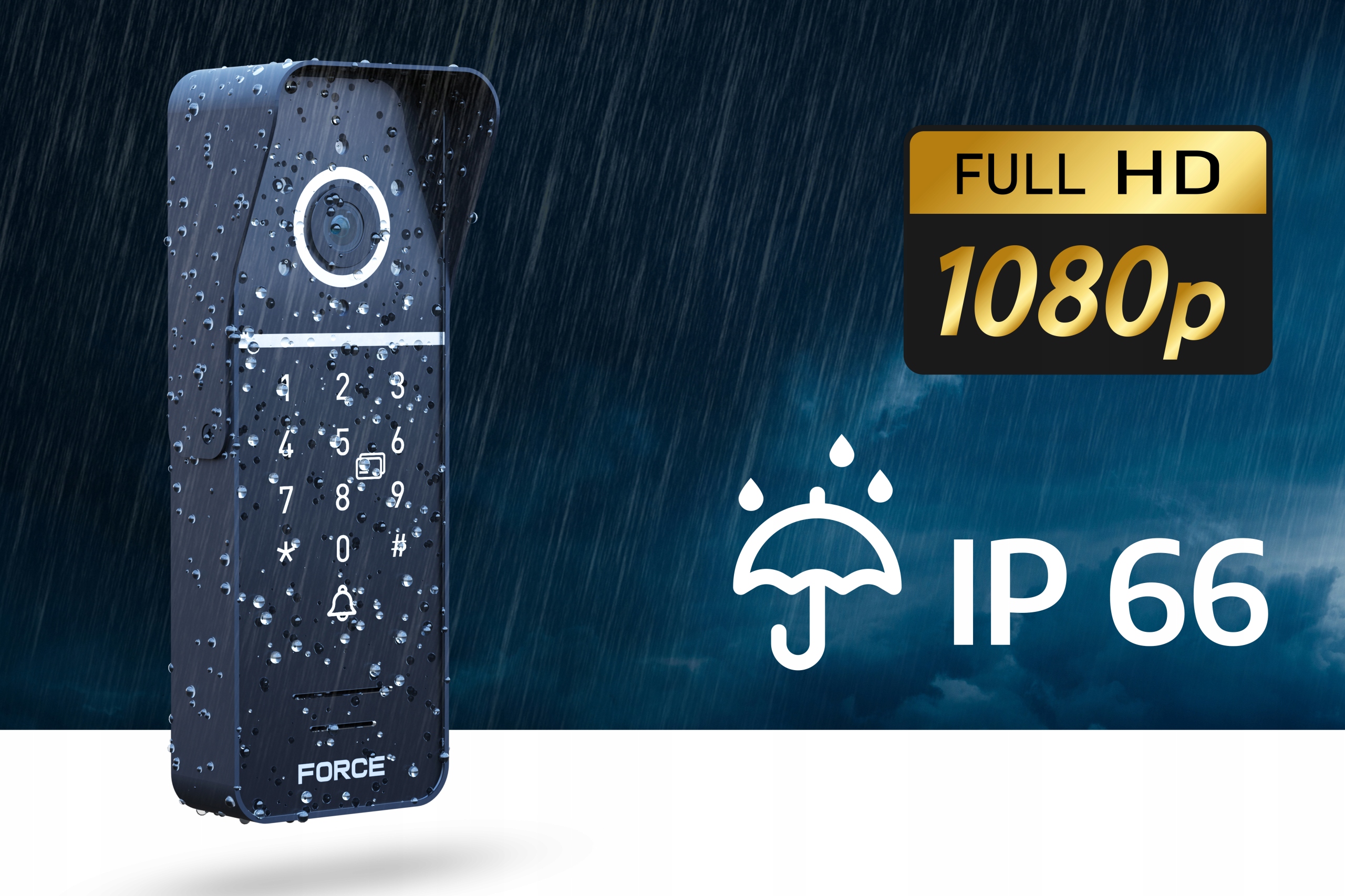 Накладная односемейная дверная станция FORCE MYWAY GS-1080P-RK-4W представляет собой устройство современного и элегантного стиля. Внешняя панель изготовлена из алюминиевого сплава, характеризующегося высоким классом герметичности IP65, что подтверждает ее устойчивость к атмосферным осадкам. Дополнительно домофон защищен крышей. Станция оснащена камерой, записывающей изображение в разрешении Full HD 1080p с объективом с полем обзора 140°, камера имеет функцию обнаружения движения.