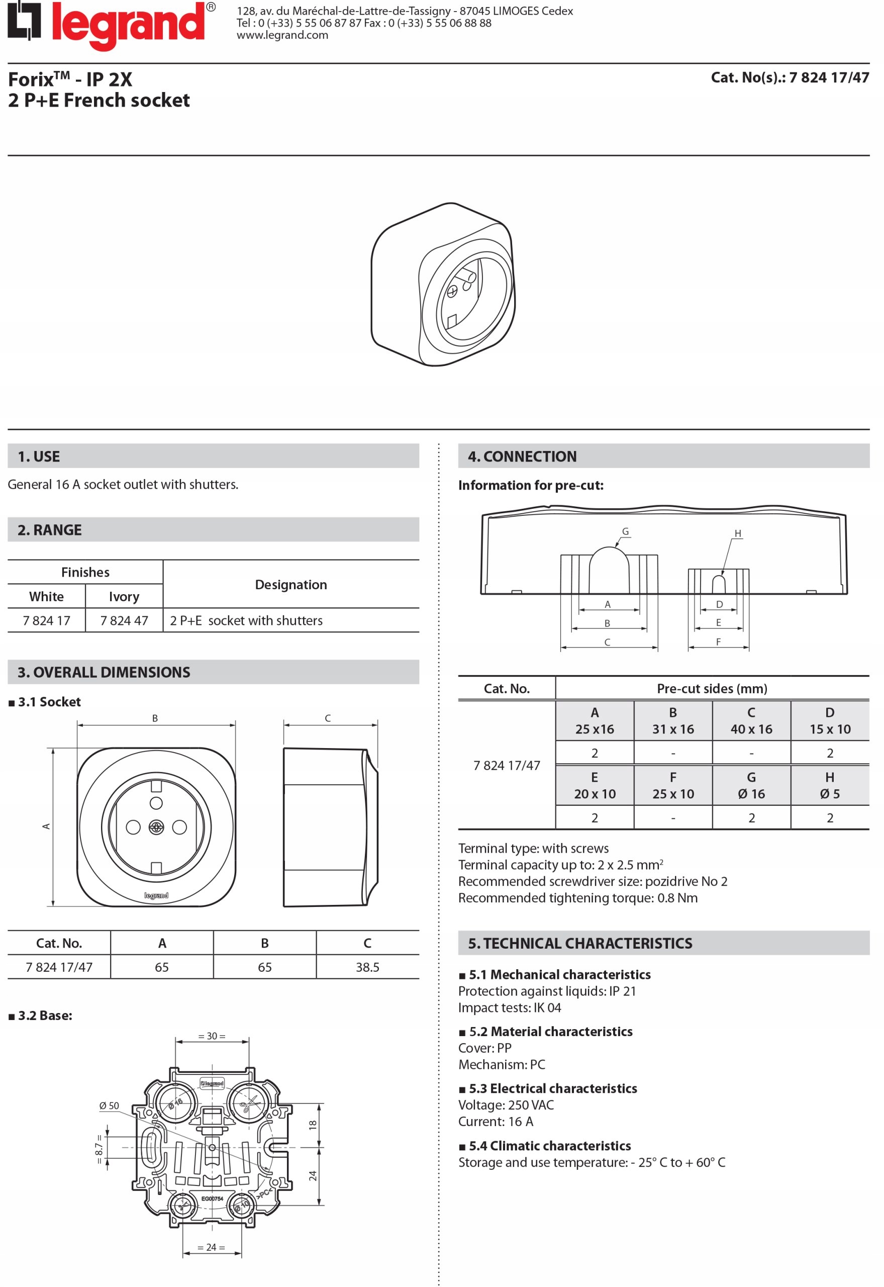 Представленная розетка с заземлением относится к серии Forix, которая имеет широкий ассортимент аксессуаров, компактную конструкцию и приглушенные цвета. Устройства могут монтироваться как накладным, так и скрытым монтажом. Он изготовлен из очень прочного белого термопластика с блестящей поверхностью. Номинальное напряжение в этой розетке составляет 250 В, а номинальный ток — 16 А. Производитель рекомендует монтаж на поверхность с помощью винтового крепления. Подключаем оборудование к цепи с помощью винтовой клеммы. IP20 — это степень защиты данного продукта. В нем заявлена устойчивость к инородным телам диаметром 12,5 мм и более. Он не будет устойчив к воде и влаге. Розетка не имеет специального блока питания или печати. Он изготовлен с защитой от детей. Бренд LEGRAND широко известен во всем мире как один из лидеров бурно развивающегося рынка электромонтажного оборудования. Базируется во Франции с 1860 года. На данный момент у нее более 30 заводов на наиболее ключевых рынках Испании, Великобритании, США, Австралии, Бразилии, Южной Кореи и др.