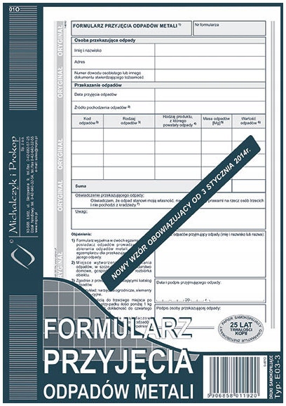ФОРМА ПРИЙМАННЯ ВІДХОДІВ Metals DRUK Papierowy Michalczyk and Prokop PRINTS