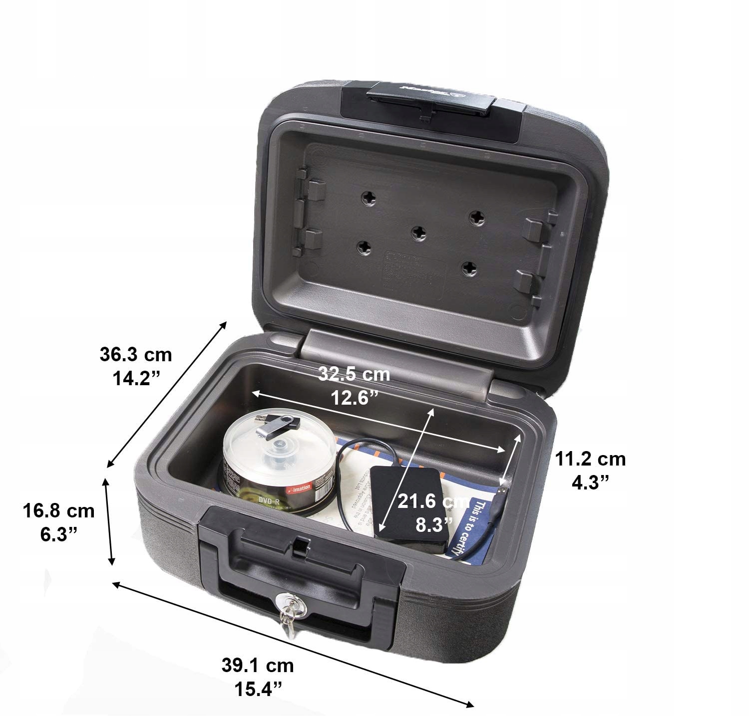 Ящик оснащен современной системой противопожарной защиты и защищает ценные вещи от возгорания (843°C) в течение 30 минут. Более того, он выдерживает погружение в воду. Ящик снабжен двумя ключами и благодаря замку не открывается во время пожара.