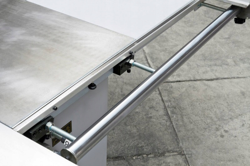 - Массивный, изготовленный из алюминия, раздвижной форматный стол со стрелой позволяет обрабатывать крупные элементы – идеально подходит для резки, например, досок