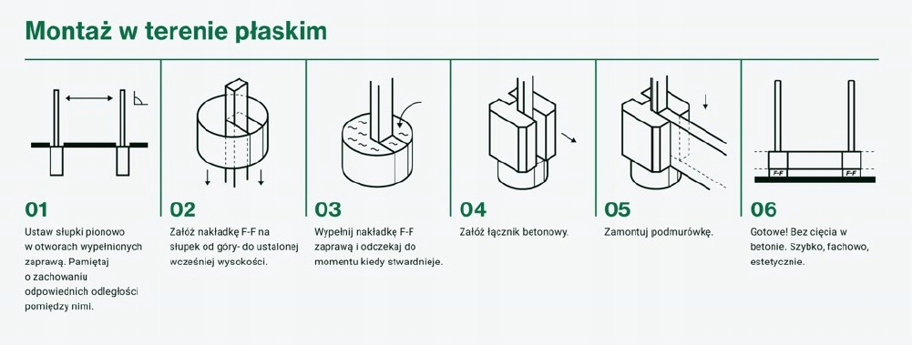 F-f образует наложение (быстрый забор- «быстрый забор») ускоряет установку заборов панелей с помощью бетонных разъемов. Обеспечивает даже поддержку фондов с обеих сторон. Универсальная форма и любая конфигурация F-F позволяют поместить забор горизонтально и в область наклона. Расширенная канал сборки ускоряется до 4 раза: без разрезания бетона он автоматически выравнивает PECK.