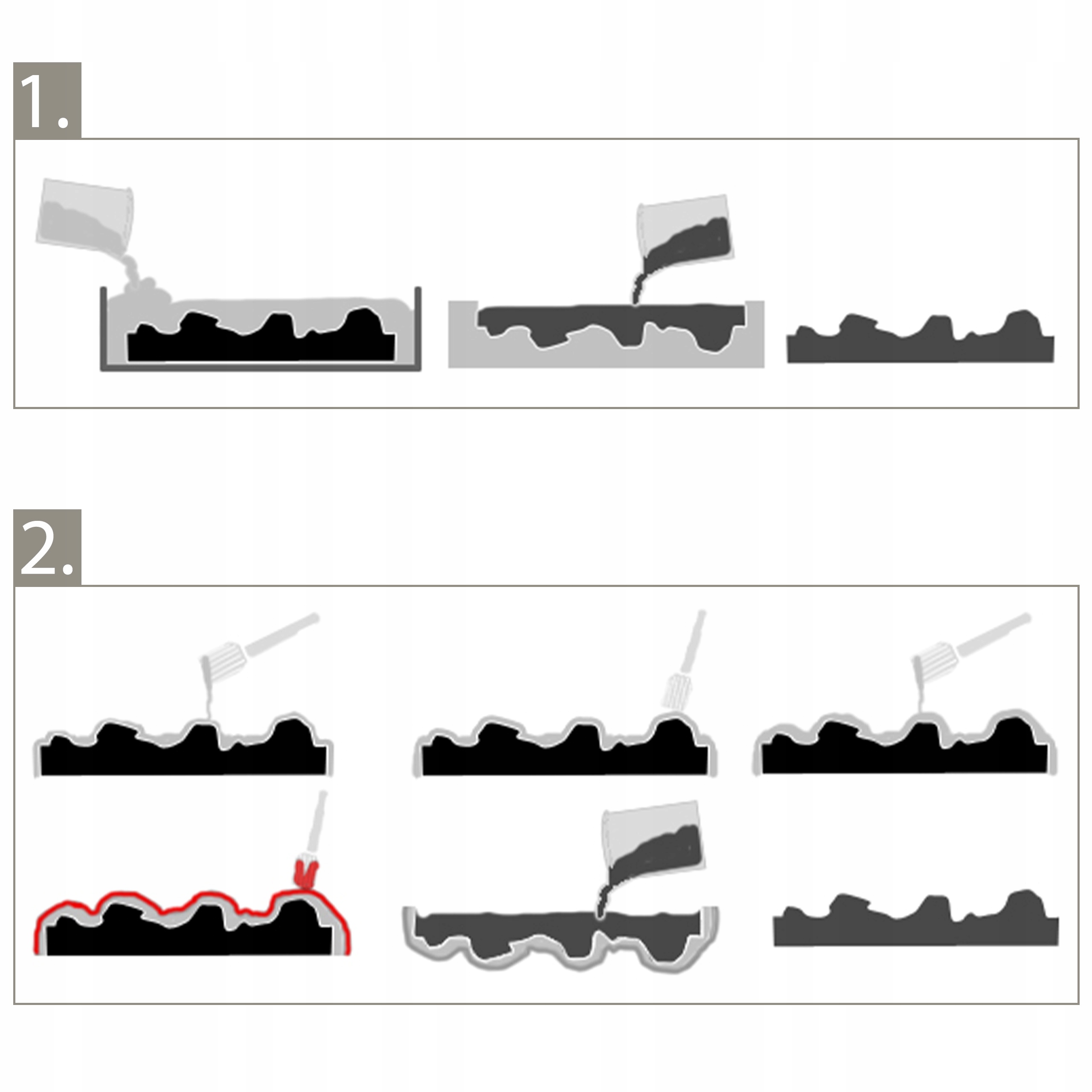 На первой иллюстрации (с пометкой «1») показан метод, при котором силикон просто выливается на модель. В этой технике: