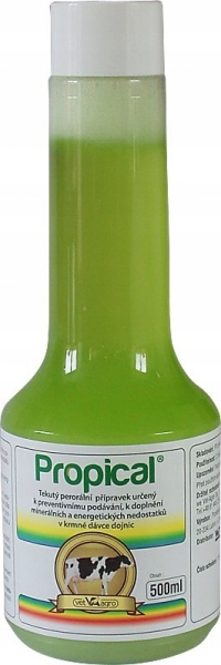 Propical - это деко -питательная смесь, содержащая источник глюкозы, ионы кальция и магния, важную в перинатальном периоде у коров. Приготовление используется в перинатальном периоде у коров для снижения риска молочной лихорадки благодаря высоким уровням кальция в виде легко доступных солей кальция или кетоза благодаря ингредиентам, обеспечивающим глюкогенные источники энергии. Магний, содержащийся в препарате, оказывает положительное влияние на поглощение и эффективность использования кальция.