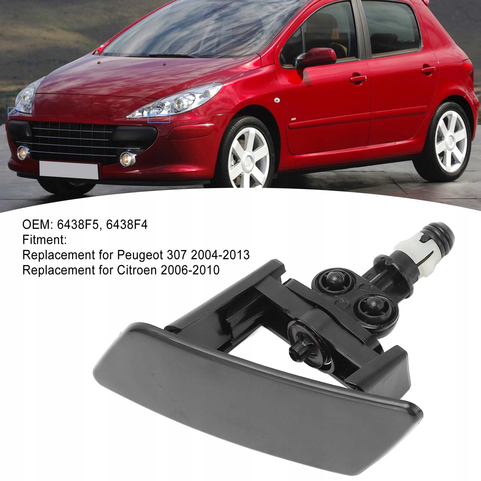 Характеристика: 1. Номер детали: согласно оригинальным заводским спецификациям, номера форсунок омывателя фар: 6438F5, 6438F4.