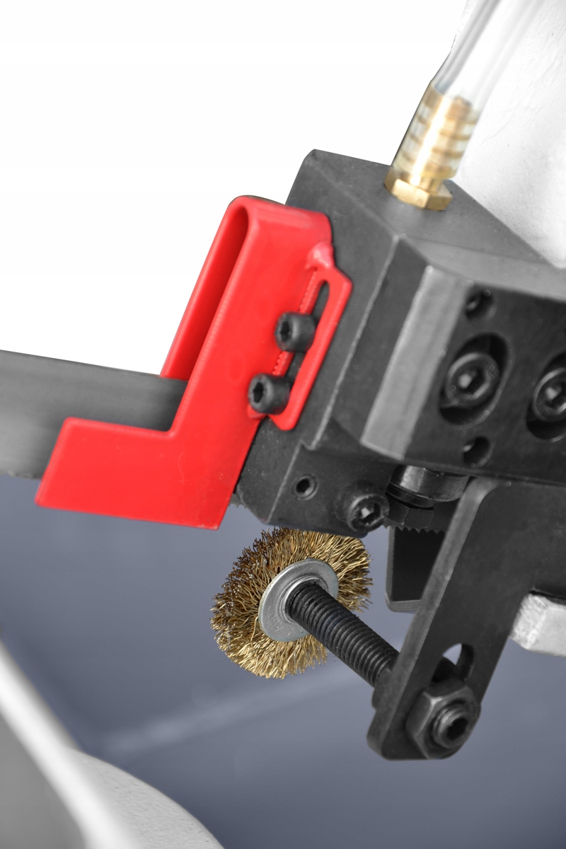 Режущий рычаг изготовлен из очень массивной однородной отливки из серого чугуна и применение режущей ленты шириной 27 мм позволяет в полной мере выполнять многосерийный рез конструкционной, нержавеющей и инструментальной стали. Тиски расположены в регулируемой станине и оснащены быстродействующим зажимом. Направляющие пильного полотна оснащены системой подшипников качения и спеченными карбидами, обеспечивающими превосходную точность и прямолинейность реза. Это оказывает огромное влияние на направляющую ленты, ее срок службы, точность и качество резки. Твердосплавные направляющие значительно снижают износ станка и пильного полотна.
