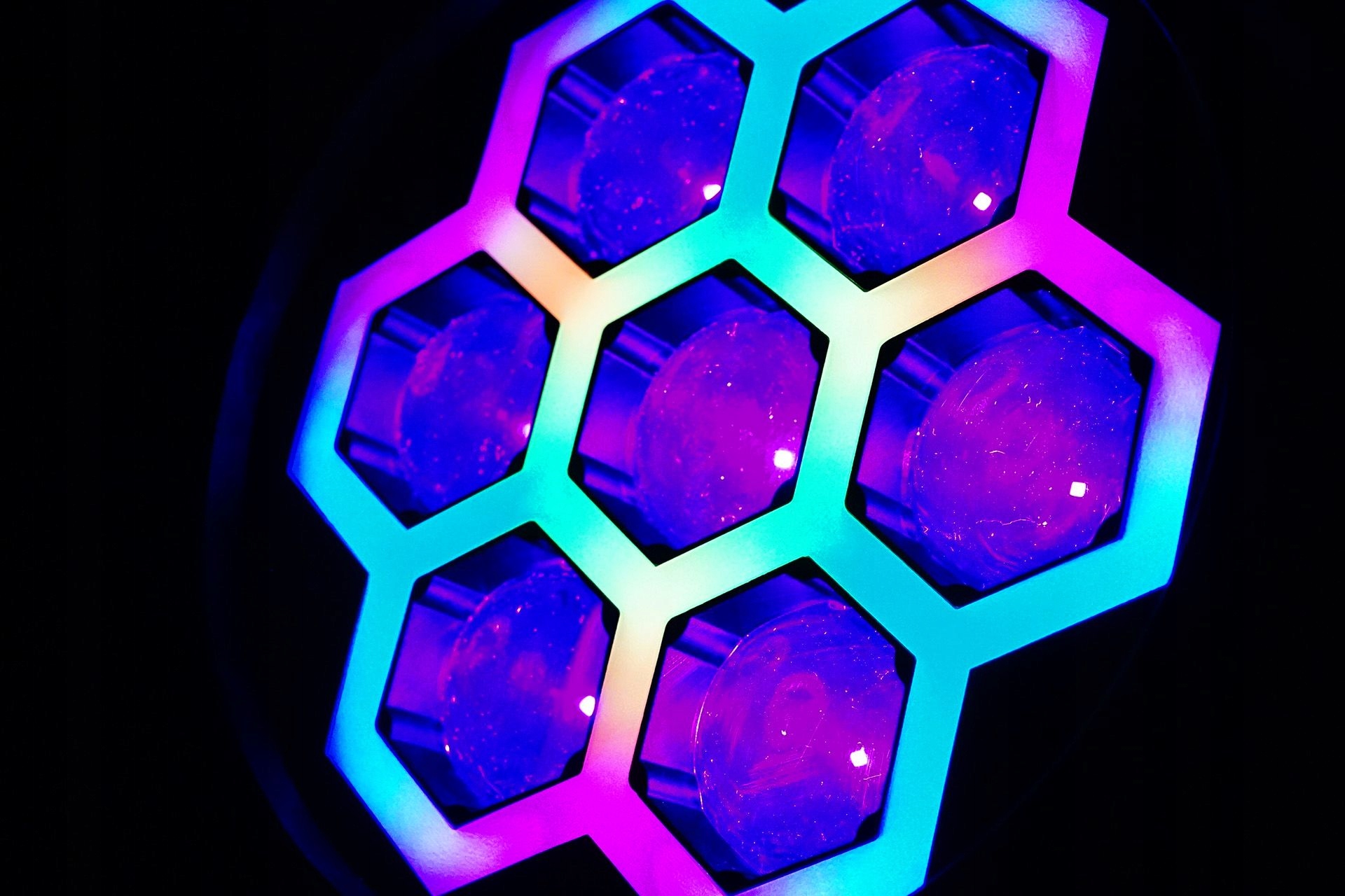 - В основе 7 светодиодов RGBW по 40 Вт для проекции заливающего света и 90 светодиодов SMD 5050 для эффекта неонового света.