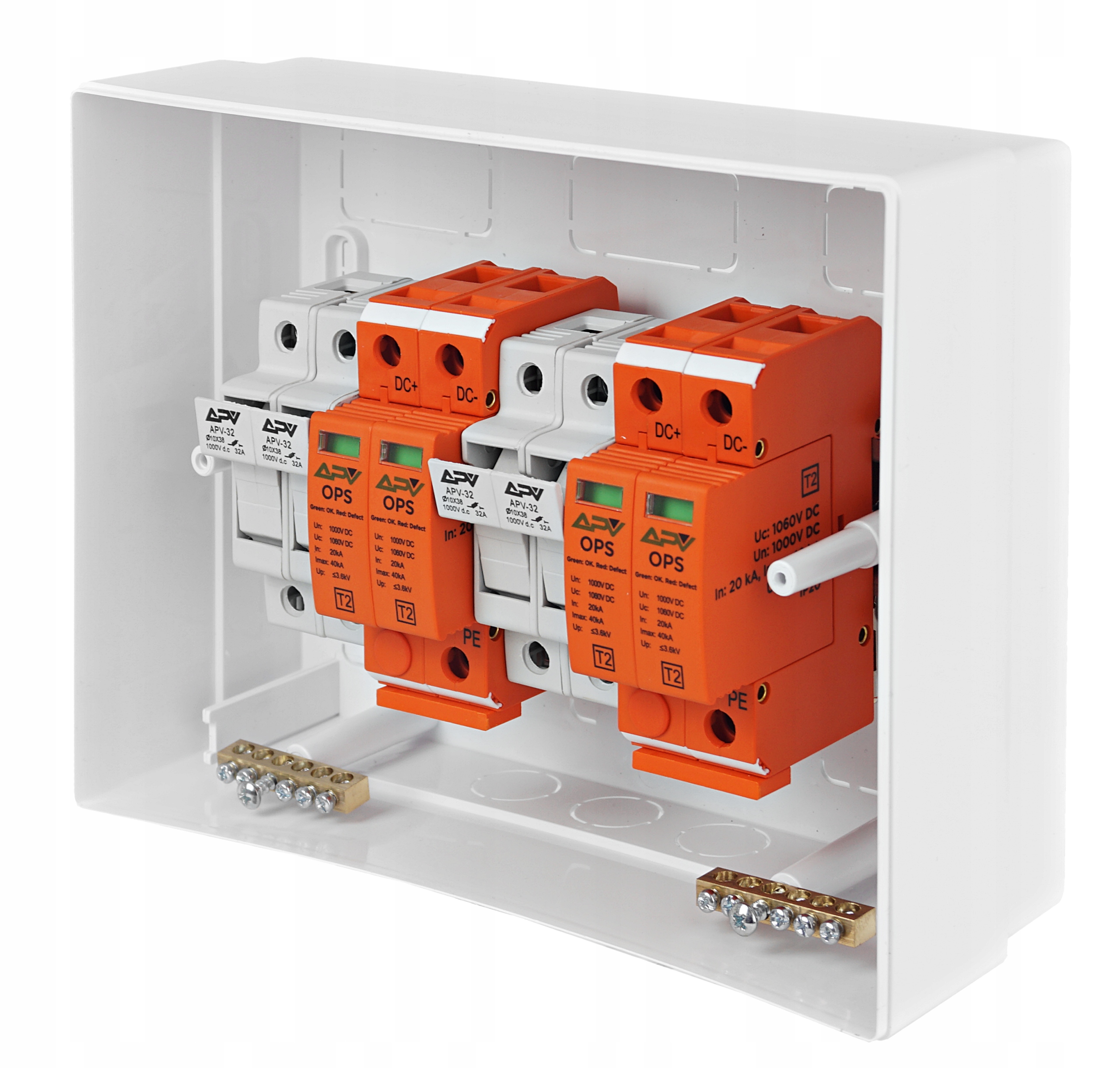 - Два выключателя с предохранителями APV, 2P 10x38 1000 В постоянного тока, состоящие из: двух оснований с предохранителями 2P и четырех gPV 15A трубчатые вставки.