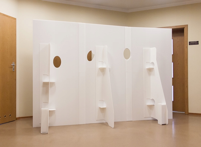 Плита этой стены, сложенная на три части, изготовлена из материала - полипропилена белого цвета, толстого. 3,4 мм с внутренней сотовой структурой. Вертикальные части соединены сзади пластиковым шарниром.