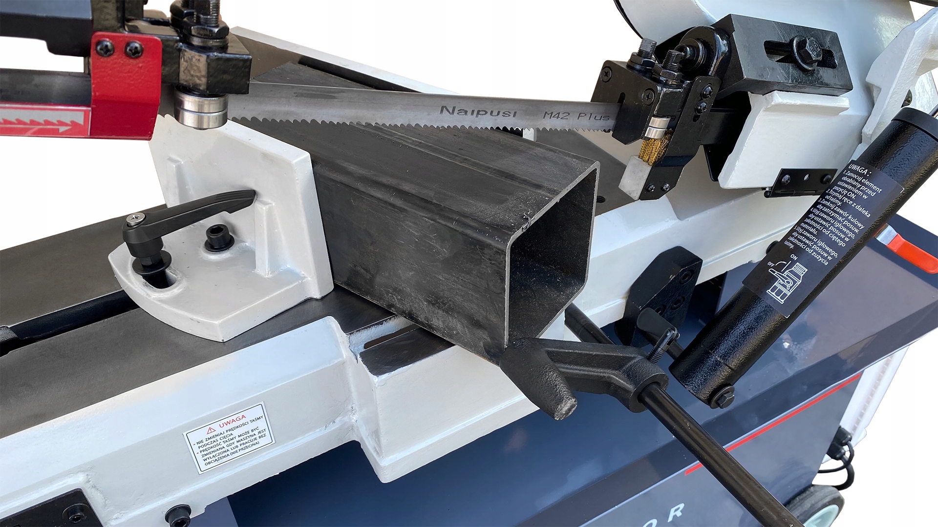 Кроме того, наша модель машины, в отличие от конкурентов, оснащена с проволочной щеткой, очищающей режущую ленту от стружки – это предотвращает засорение пильного полотна и повышает эффективность резки.
