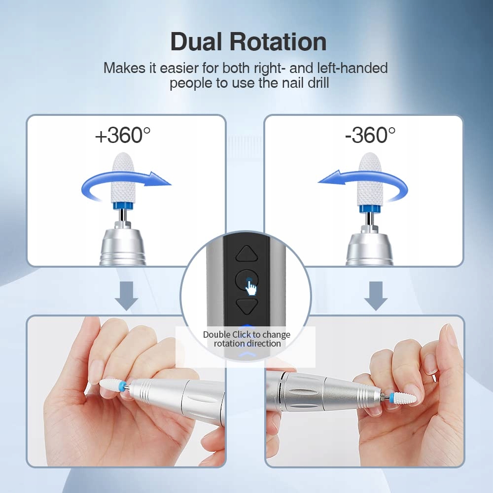 Эта аккумуляторная дрель для ногтей с прямым или обратным направлением вращения подходит не только для правшей, но и для левшей.