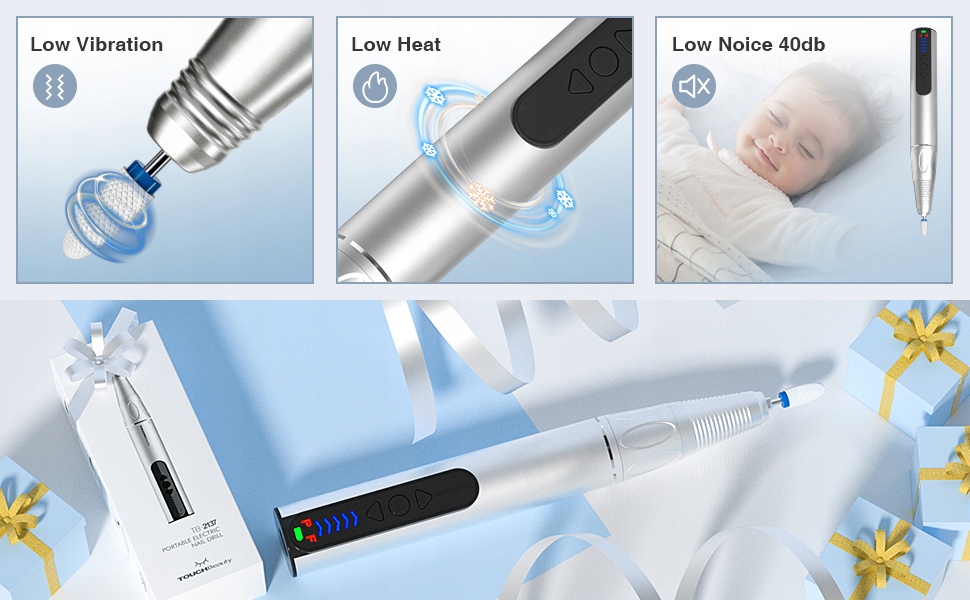Электрическая дрель для ногтей TouchBeauty имеет высококачественный алюминиевый корпус, который прочен и долговечен, но при этом остается элегантным. Встроенный бесщеточный двигатель тихий и эффективный, с низким тепловыделением и низким уровнем шума, поэтому ваши ногти не повреждаются. Подключи и пользуйся, зарядка не требуется, компактный и портативный, безопасный, эффективный и профессиональный. Со множеством режимов и множеством аксессуаров