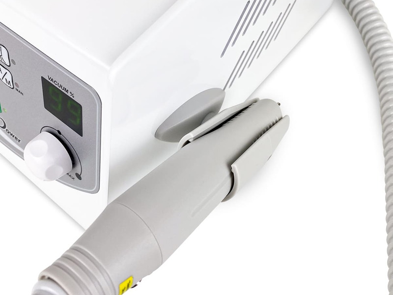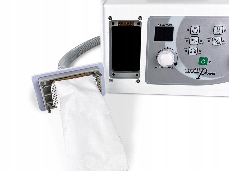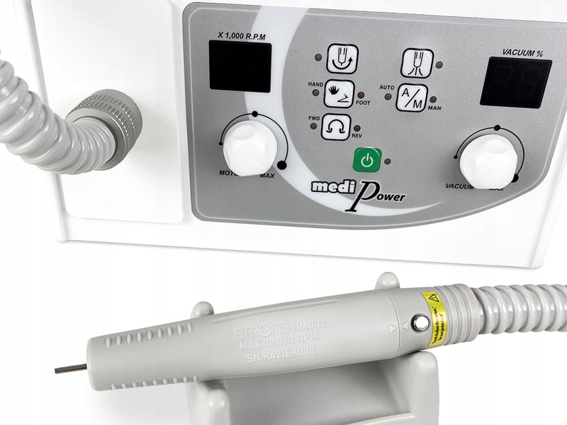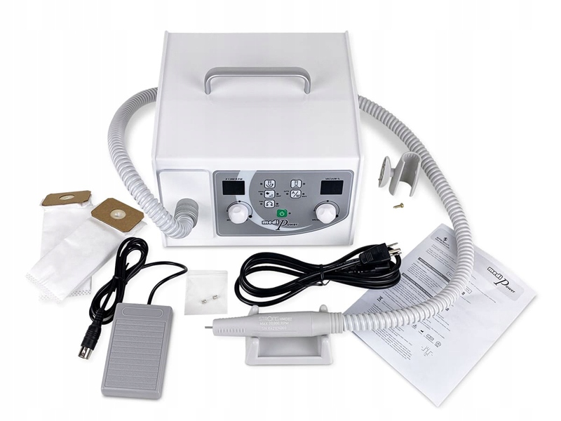 Фрезерный станок для педикюра и маникюра с пылепоглотителем модели Strong, Medi Power. Фрезерный станок предназначен для педикюра, подиатрии, а также для маникюрных работ. Корпус рукоятки из пластика обеспечивает небольшой вес, что делает работу с фрезером Medi Power менее обременительной. Пылепоглотитель всасывает пыль непосредственно из рабочей зоны фрезера, а установленные внутри фильтры и мешок гарантируют, что пыль не попадет обратно в офис.