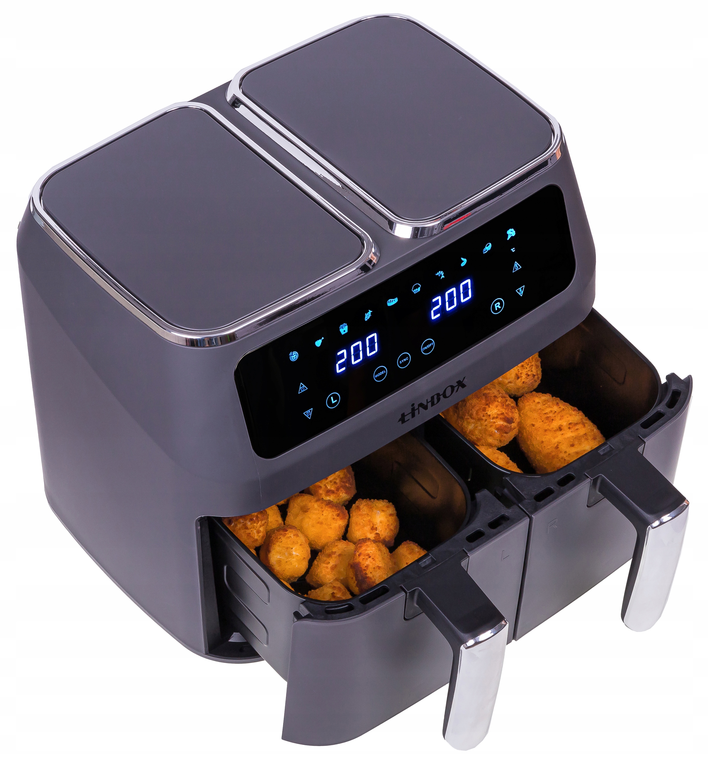 Во фритюрнице имеются 2 независимые корзины. Благодаря этому мы можем одновременно готовить 2 разных продукта. Например, в одной находится картошка фри, а в другой — крылышки или голени.