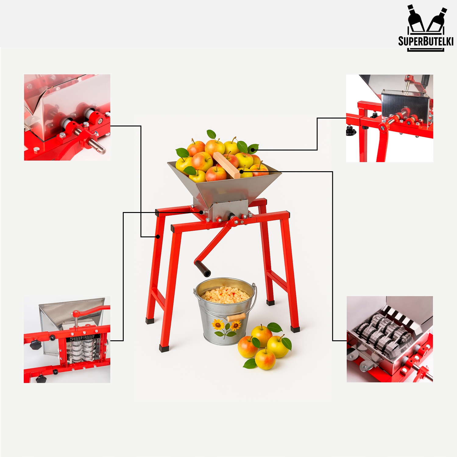 ⚙️ Система стальных роликов — Эффективные режущие ролики эффективно измельчают фрукты, подготавливая их к прессованию или ферментации.