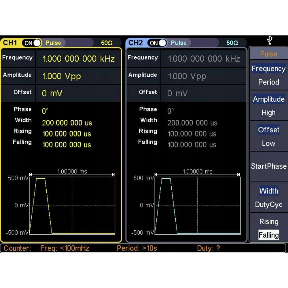 - Тип выходного сигнала: Произвольный, Шумовой, Импульсный, Прямоугольный, Синусоидальный, Треугольный