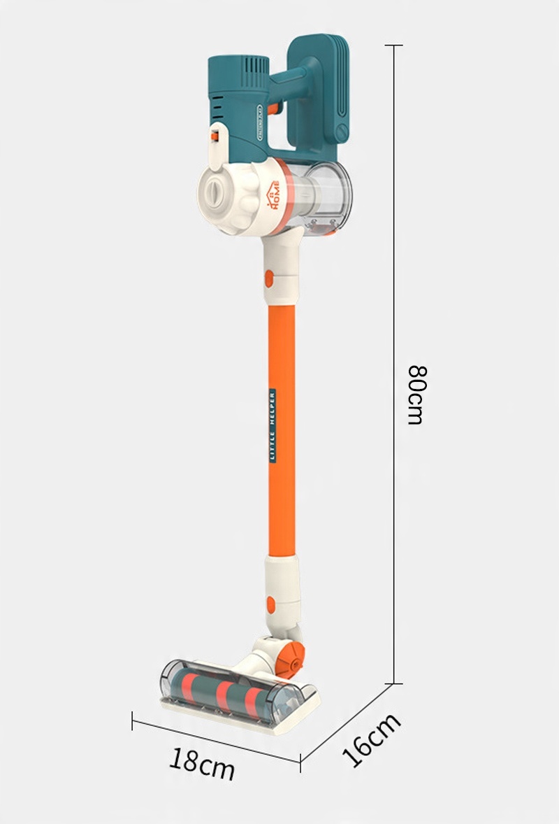 Игрушка вертикальный пылесос серо-оранжевого цвета с синими элементами. Он оснащен функцией всасывания. Имеет съемный контейнер для мусора, который можно опорожнить самостоятельно.