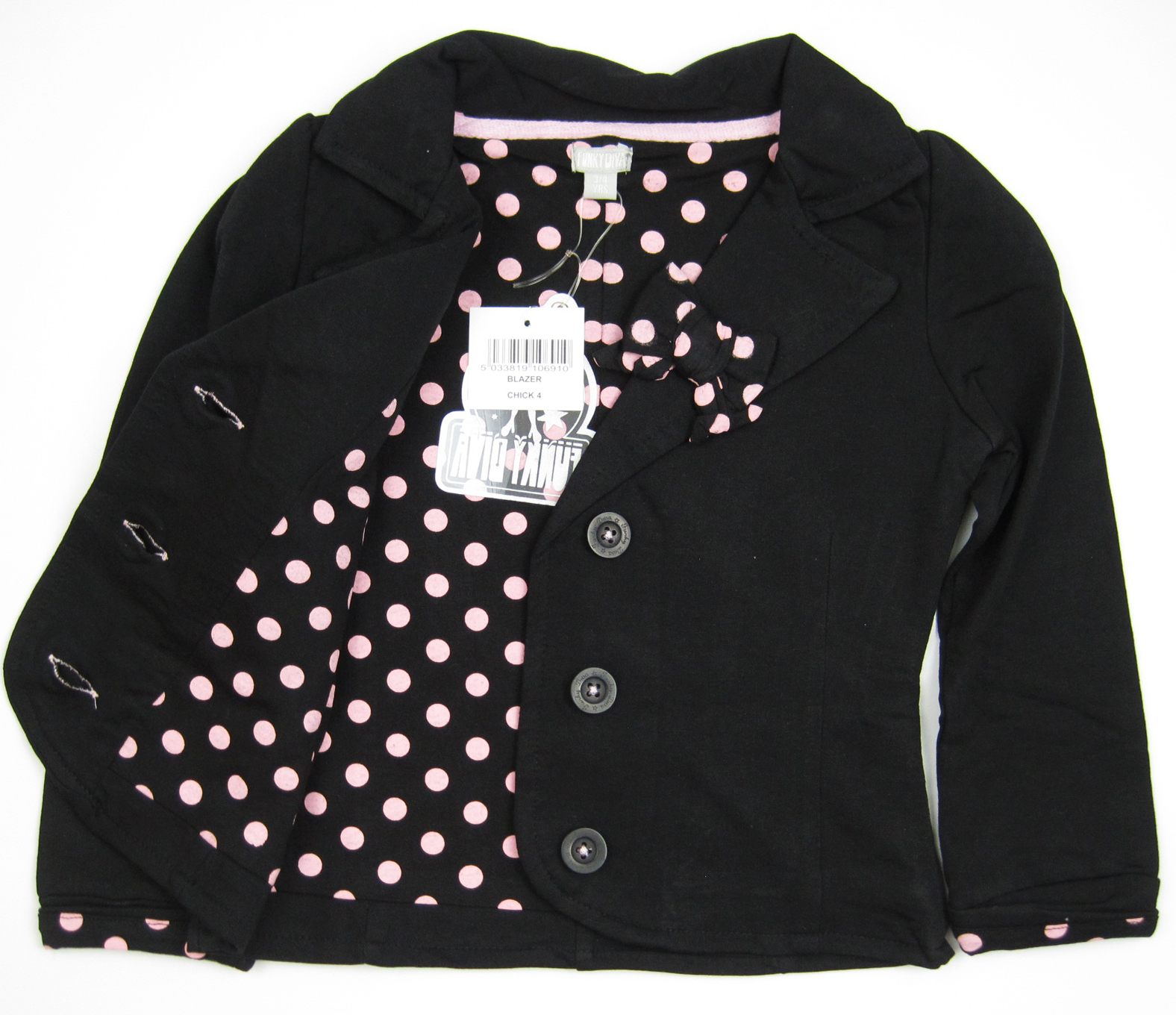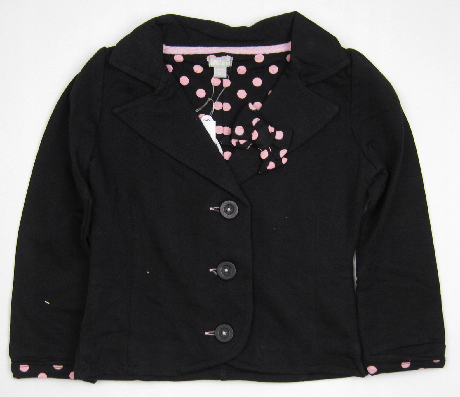 - Черная куртка. Низ украшен розовым горошком.