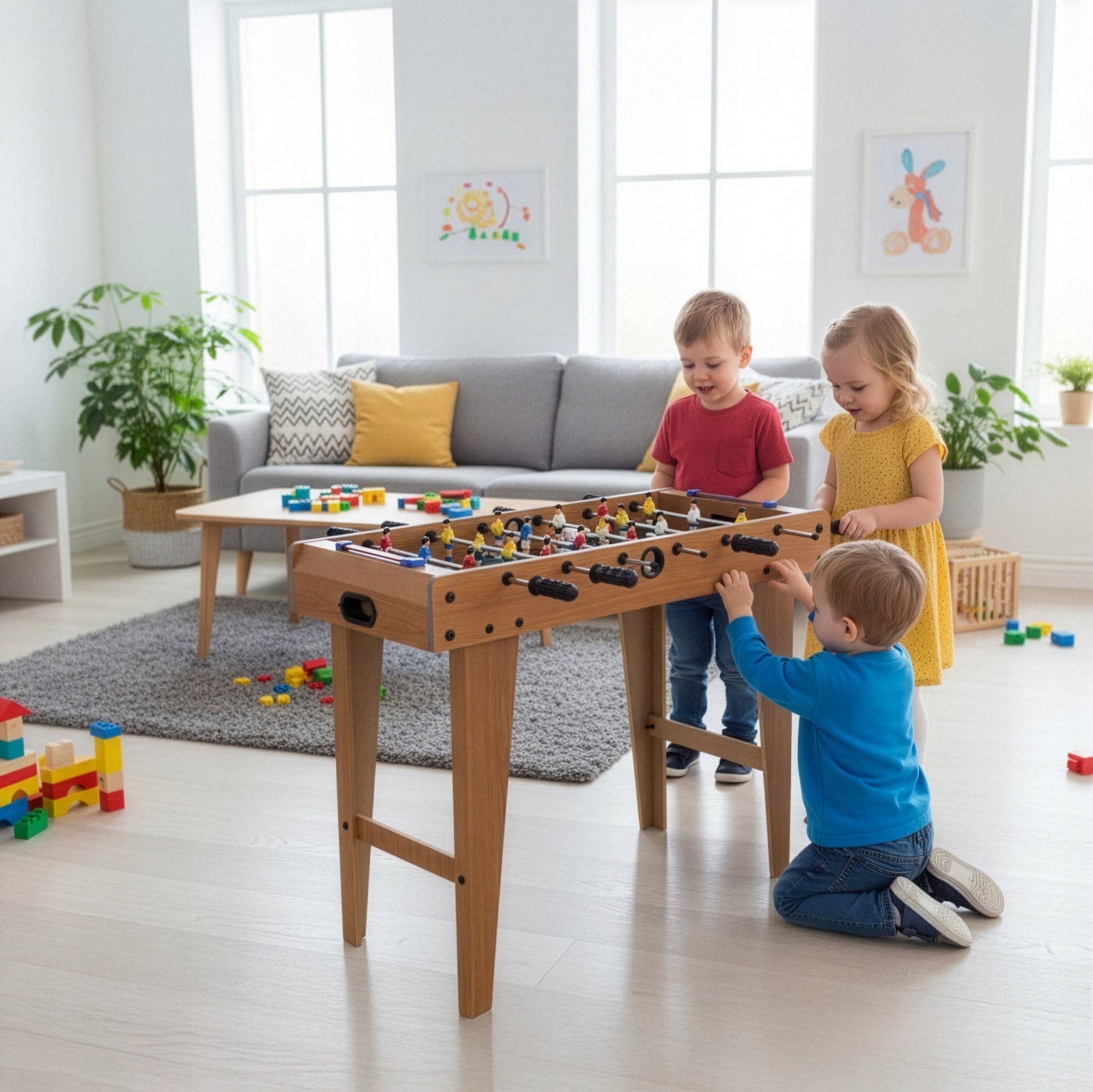 Размеры стола, поля и игровых элементов обеспечивают комфорт использования для детей. Соответствующая высота ножек и ширина ворот адаптированы для комфортного обращения с мячом и управления фигурами. Это делает игру привлекательной и увлекательной даже после долгой игры.