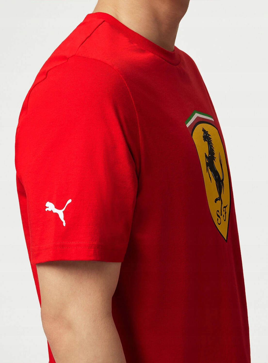 Классическая мужская футболка Scuderia Ferrari F1 с большим щитом Scudetto спереди и изящным логотипом бренда PUMA на правом рукаве.