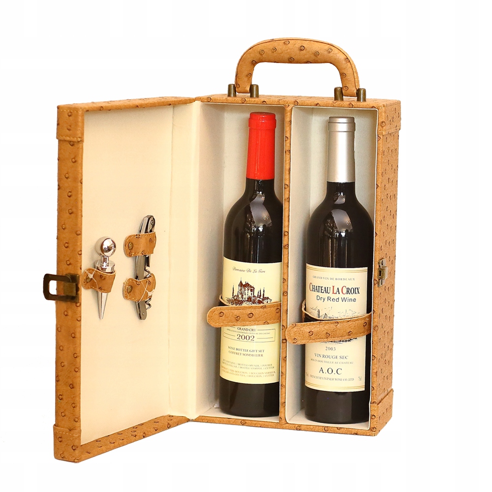 Очень интересный набор контейнеров для вина вино вино с аксессуарами. Контейнер изготовлен из материала, напоминающего кожу, по фактуре напоминающего кожу страуса. Корпус светло-коричневый. Внутри контейнера, покрытого мягким кремовым материалом, есть два отдельных отделения для двух бутылок вина. Бутылки со спиртным следует закреплять «ремнями безопасности», чтобы они не выпали при открытии коробки. На внутренней стороне крышки имеется пробка и открывалка. Контейнер оснащен застежкой и ручкой для переноски.