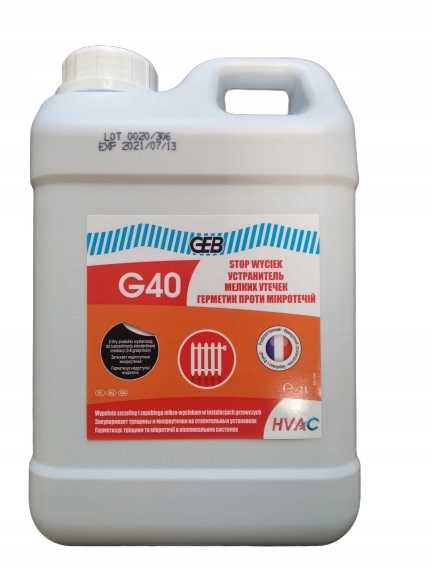Перед применением перемешать содержимое контейнера. Разбавить водой в пропорции 1 часть продукта G40 на 5 частей воды. Залейте смесь в оборотную воду комнатной температуры через выходное отверстие самого верхнего радиатора из расчета 2 литра воды на 100 литров воды. Закройте радиатор и выровняйте давление. При необходимости добавьте в систему достаточно воды для достижения минимального давления (1 бар). Откройте все краны, запустите котел и нагрейте воду до 80 градусов (это оптимальная температура герметизации). Поддерживайте эту температуру в течение 2-3 часов. Оставьте раствор в работающей установке для герметизации возможных утечек.
