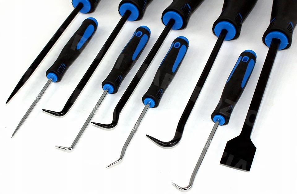 Набор в основном используется для снятия уплотнительных колец, колец, симеринтов и других трудносъемных элементов машин, двигателей и т.п. Ручки покрыты противоскользящей резиной и имеют отверстие для подвешивания, самая большая ручка имеет плоскую стамеску толщиной около 2 мм.