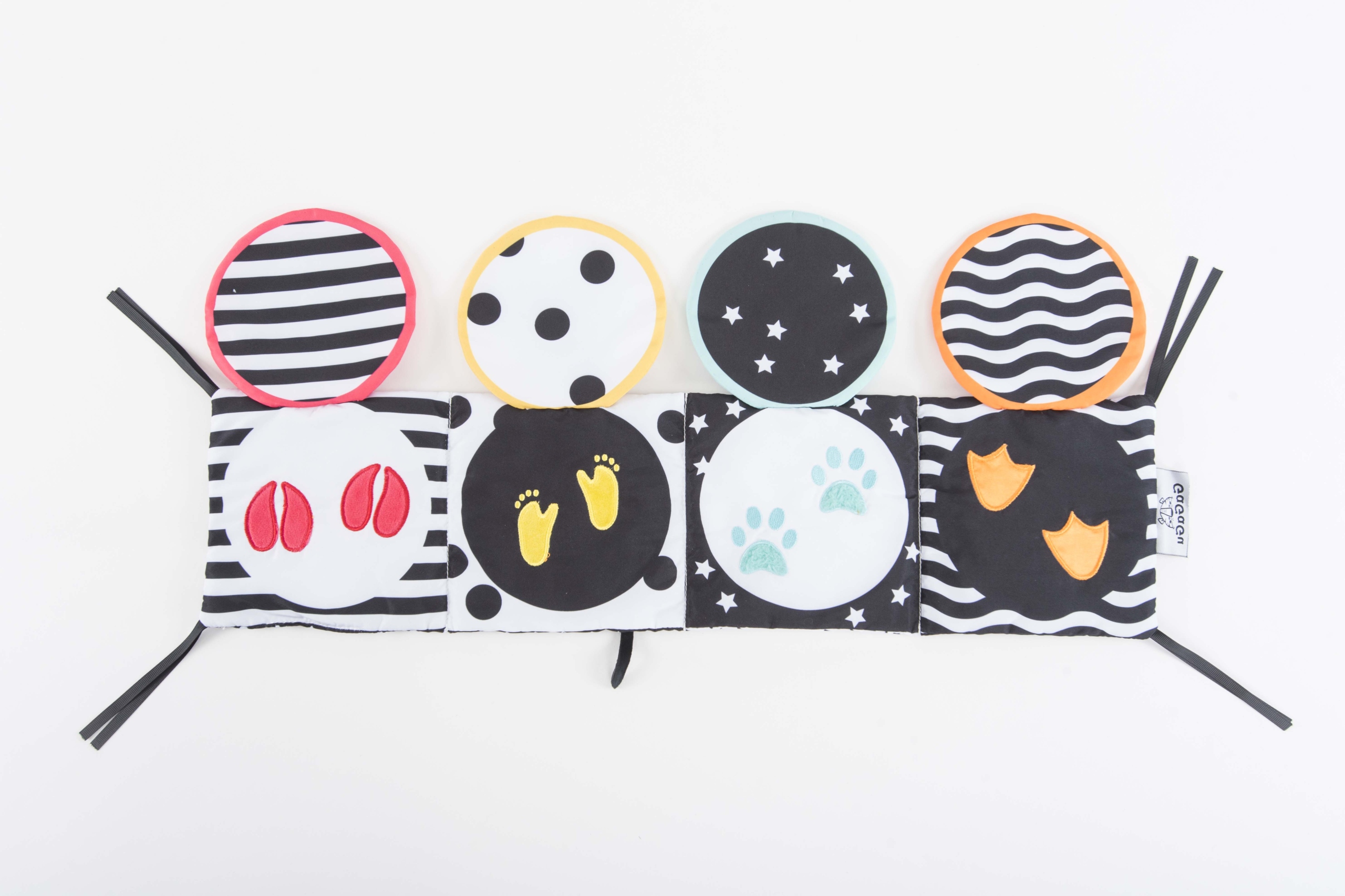 Сенсорная книжка GaGaGu имеет контрастные цвета и узоры, которые стимулируют зрение ребенка. Книга двусторонняя. С одной стороны, это контрастные иллюстрации животных с вышитыми элементами, которые обеспечивают заметно разную фактуру под пальчиками ребенка, тактильную стимуляцию и освоение ребенком разных фактур. С другой стороны расположены круглые плюшевые клапаны, которые позволяют вашему ребенку играть в одну из своих любимых игр и какать! - каждый клапан с обеих сторон напечатан разным рисунком – один элемент, два совершенно разных визуальных впечатления. Под плюшевыми лоскутками с изображениями животных расположены символы пищи, которую ест животное + в плюшевые лоскуты вшит материал, который шуршит и шуршит при открытии и прикосновении - ребенок поменьше изучает разные формы и цвета и получает слуховую стимуляцию, ребенок постарше узнает, какую пищу ест данное животное.