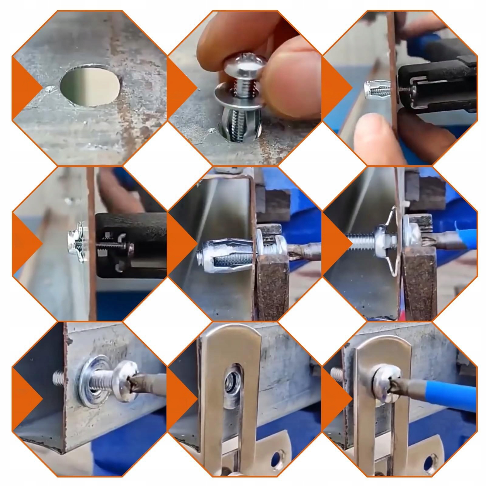 Простота установки: Распорные гайки легко установить. Просто поместите анкер в отверстие и вкрутите в него винт. С помощью заклепочника или гаечного ключа сильно вытяните винт наружу, пока штифт с углублением не превратится в лепесток на панели. Затем затяните винт с помощью отвертки и закрепите его материалом, который вы хотите закрепить.