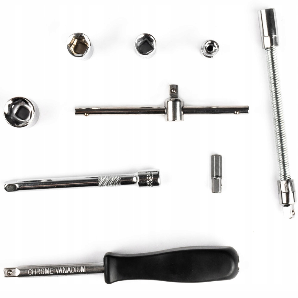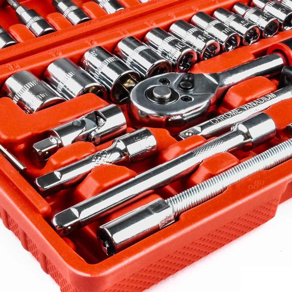 Набор торцевых ключей состоит из 46 элементов, изготовленных из высококачественной хромованадиевой стали.