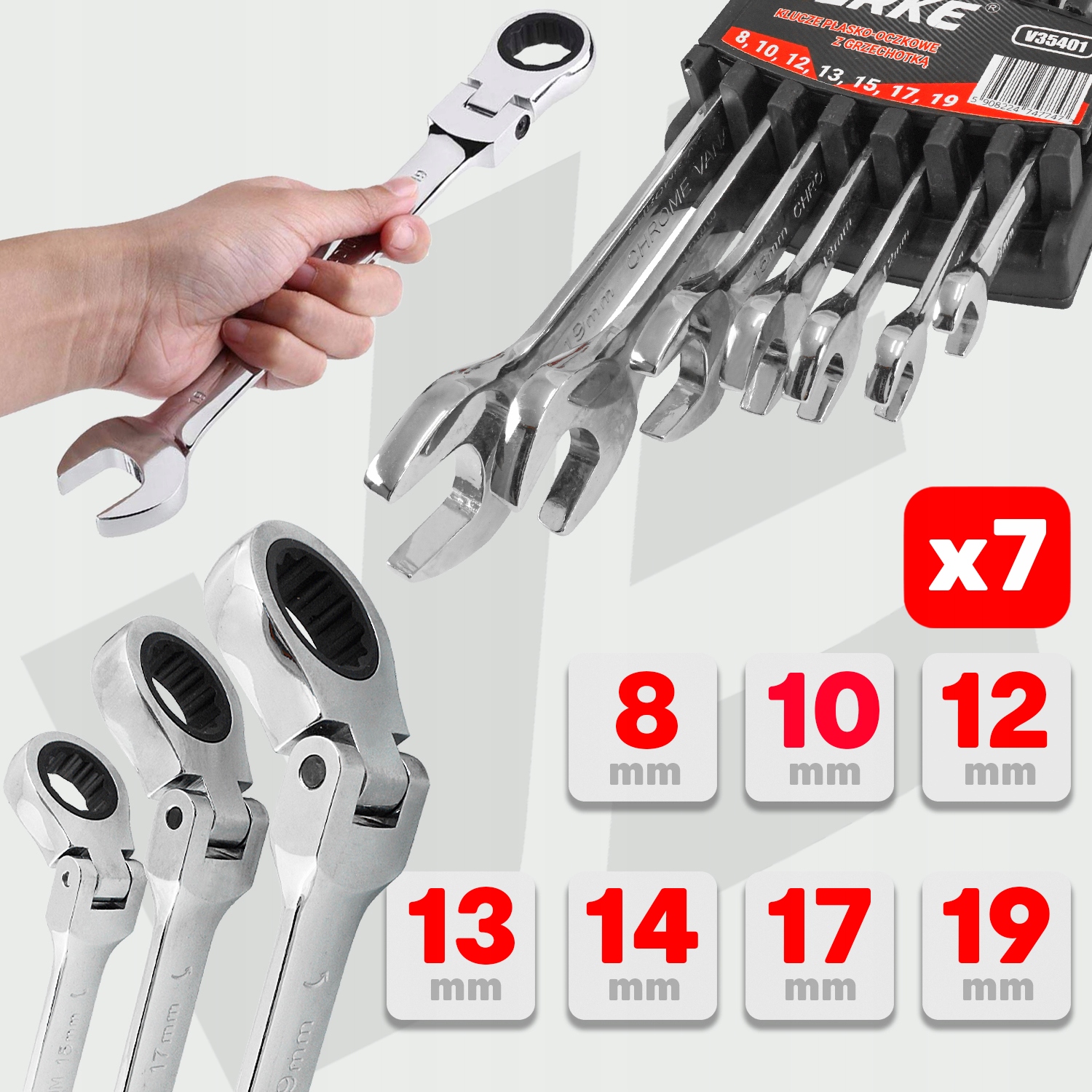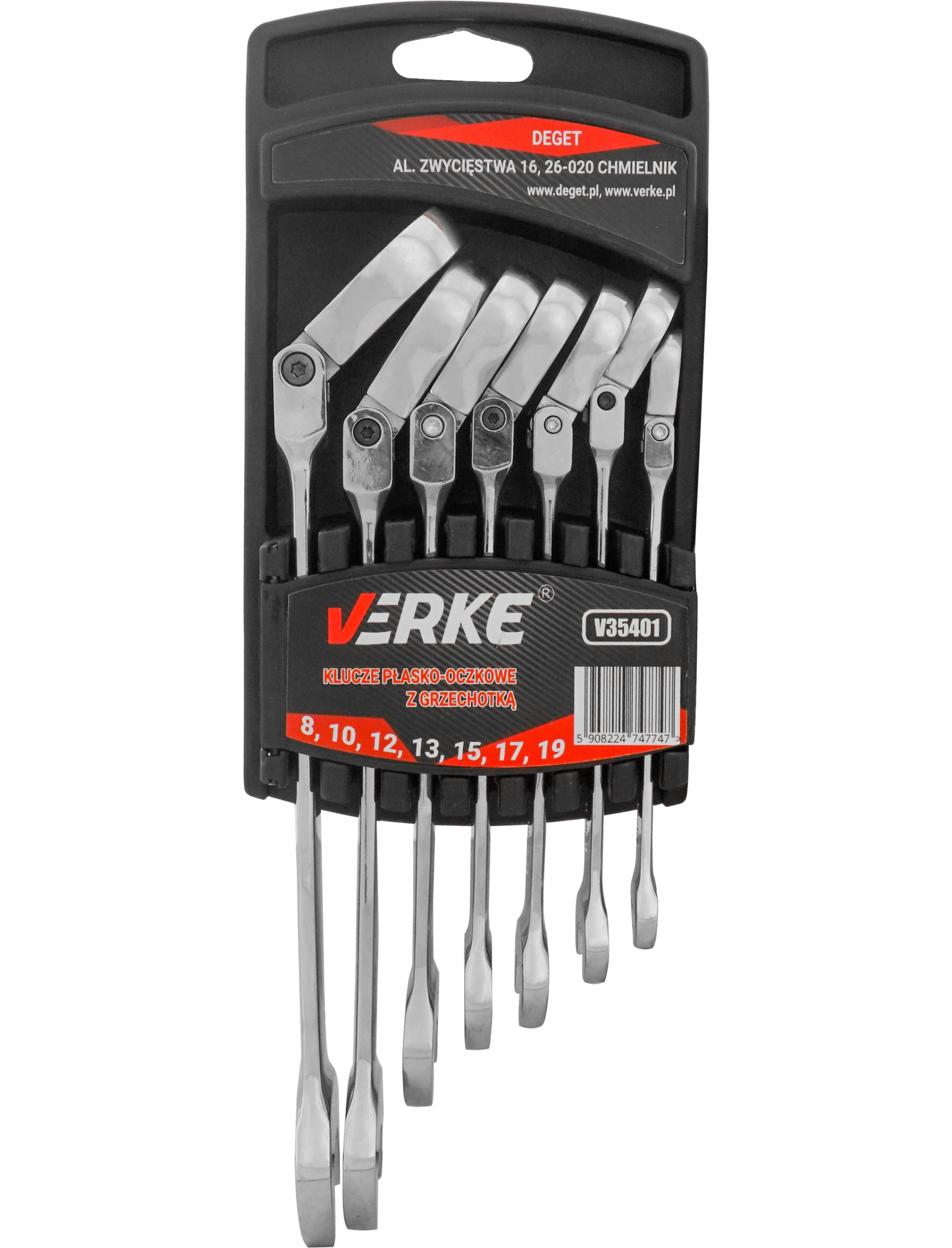 КЛЮЧИ С РАЗРЫВНЫМИ КОЛЬЦАМИ С ТРЕЩОТКОЙ 8-19ММ, 7 ПРЕДМЕТОВ. КЛИП ВЕРКЕ