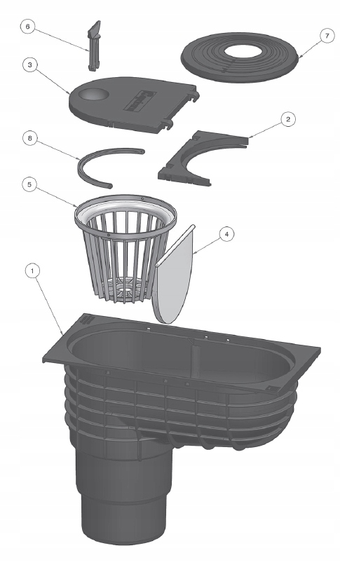 Сливная труба желоба вставляется в отстойник желоба через вставной диск, оснащенный насечками, позволяющими регулировать диаметр водосточной трубы под соответствующий диаметр. Загрязнения, переносимые дождевой водой (листья, ветки и т. д.), остаются в корзине. Отвод воды из отстойника осуществляется через сливной патрубок в ливневую канализацию.