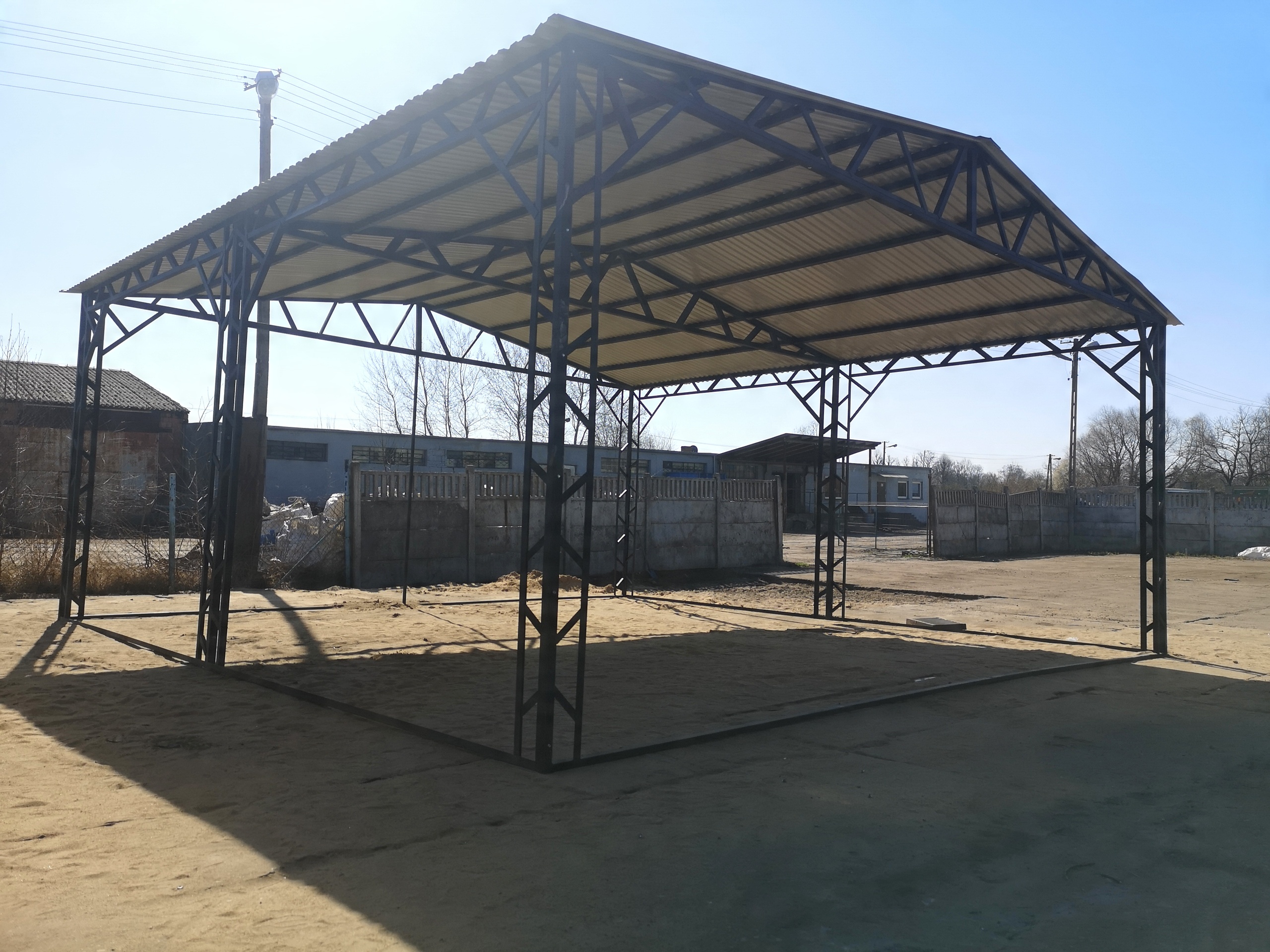 Навес 6х6 с двускатной крышей выполнен из ферм закрытого профиля, благодаря чему все нагрузки равномерно распределяются на несущие конструкции конструкции и стены. Это очень прочная конструкция с решетками по всему периметру, выдерживающая огромные нагрузки и ветер, прочно построенная с большой точностью, отвечающая ожиданиям самых требовательных клиентов. В комплект навеса 6х6 входит трапециевидный лист для крыши, прочная стальная конструкция и сборка на месте у заказчика.