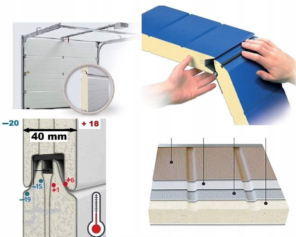 - Панели построены на основе принципа слоистой пластины : стальная пластина - пена PU с высокой плотностью (не содержит Freon) - стальный лист). Защита "защищает пользователя от пальцев. В передней части гаража на ролике на ролике на ролике, который уравновешивает вес и вызывает свободное открытие и закрытие - (сила примерно в 20 000 циклов )