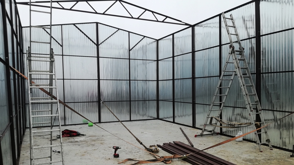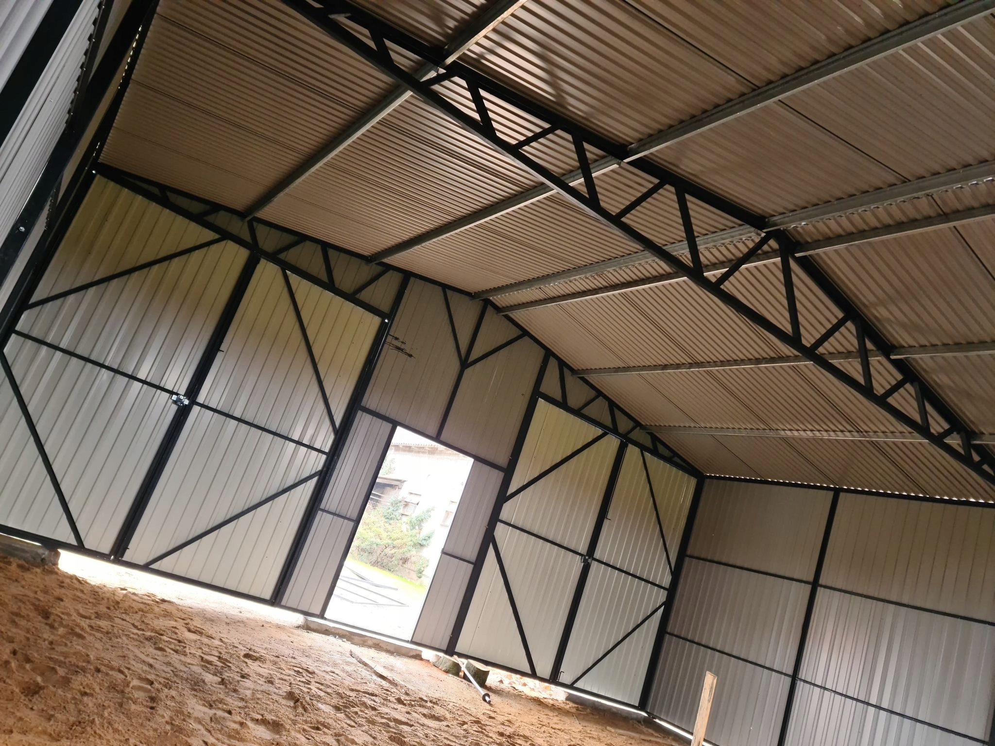 б> Нет необходимости использовать несущие колонны внутри зала или склада, что позволяет более эффективно использовать пространство внутри объекта.Крыша выполнена из ферм закрытого профиля, а это значит, что все нагрузки равномерно распределяются на конструкцию зала и стены. Для стен также использовались закрытые профили, которые были дополнительно укреплены горизонтальными стойками. Весь жестяной гараж покрыт первоклассным оцинкованным листом. Каждый элемент может быть окрашен в любой цвет, доступный из цветовой палитры на аукционе.