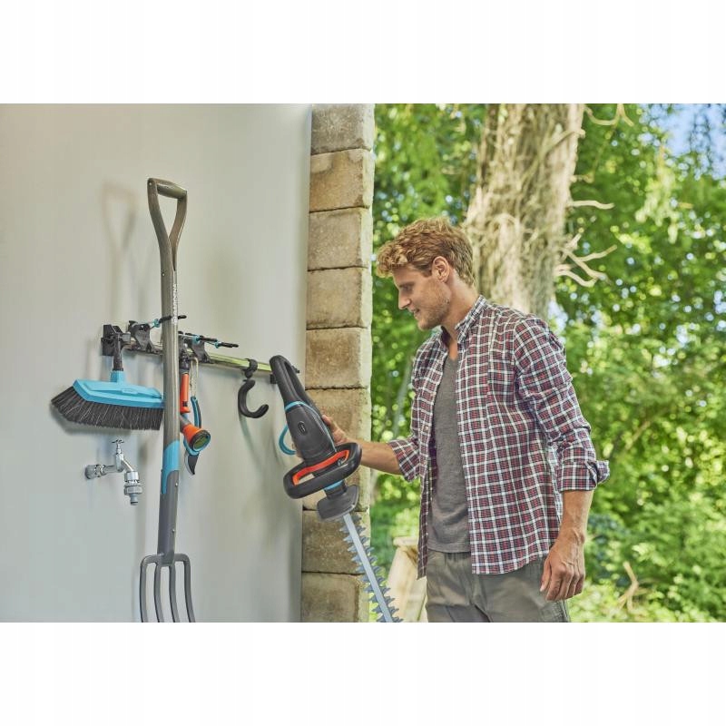 Плюс Вешалка для инструментов поможет сэкономить место при хранении тяжелых садовых инструментов, таких как лопаты и вилы, а также элементов комбисистемы GARDENA и крупных цельных инструментов.