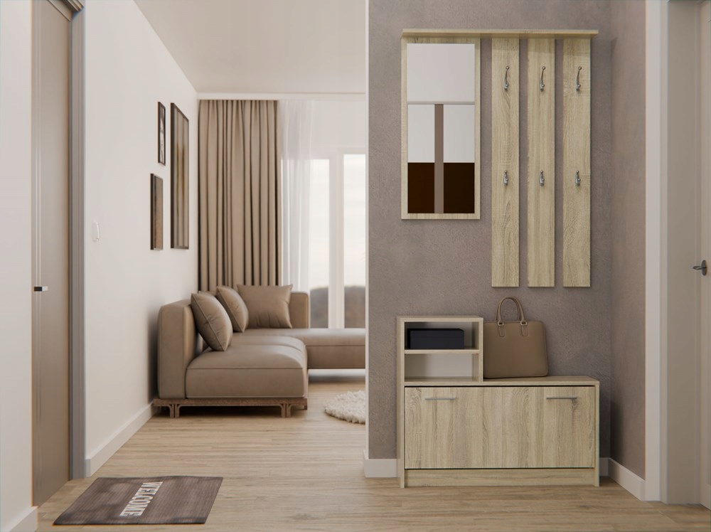 Благодаря продуманной конструкции мебель занимает мало места, поэтому отлично подойдет как для больших, так и для маленьких прихожих