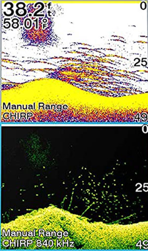 - Какое зрелище. Используйте преобразователь для объединения традиционного сонара CHIRP и сонара ClearVü.