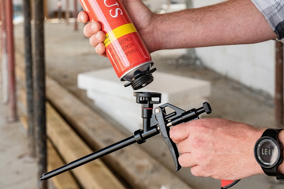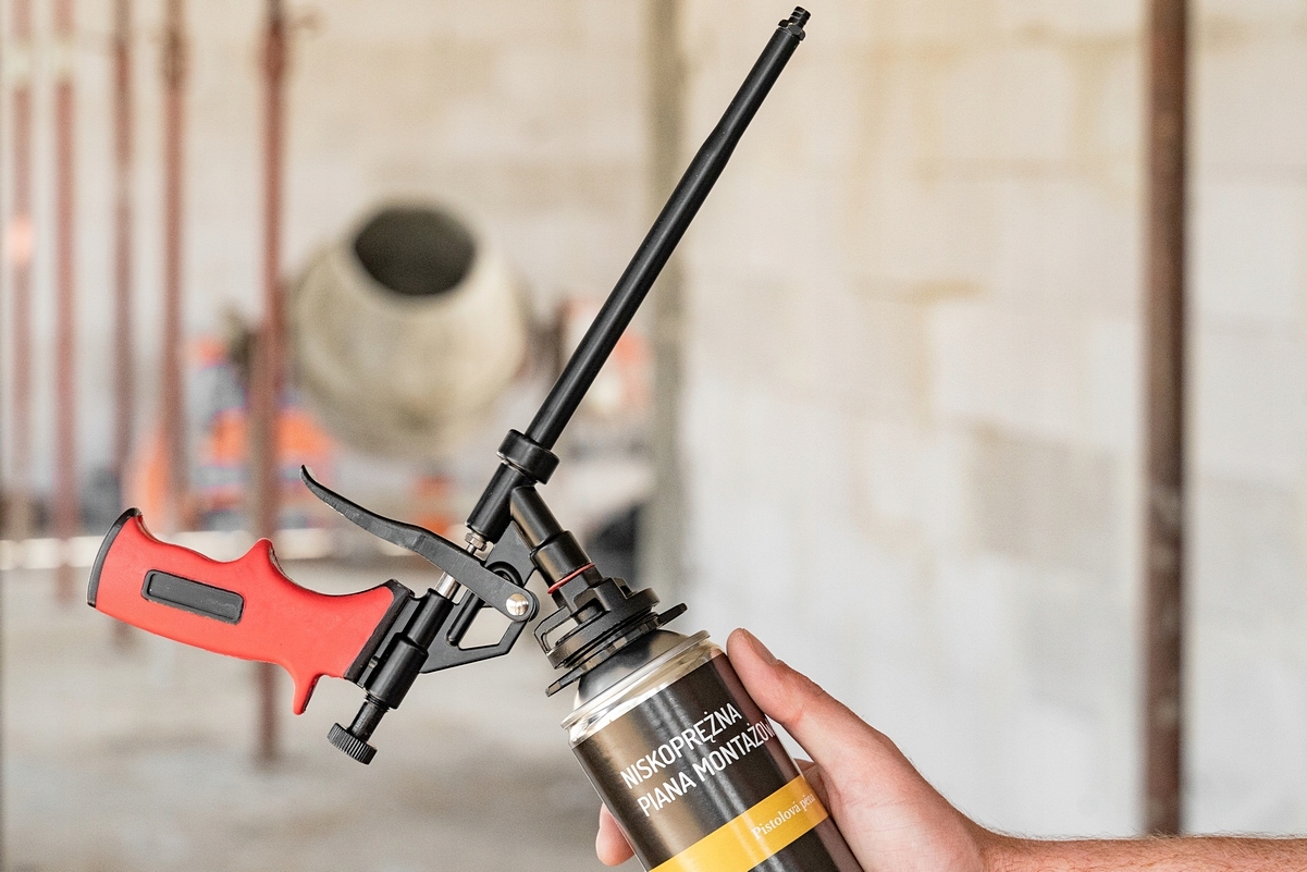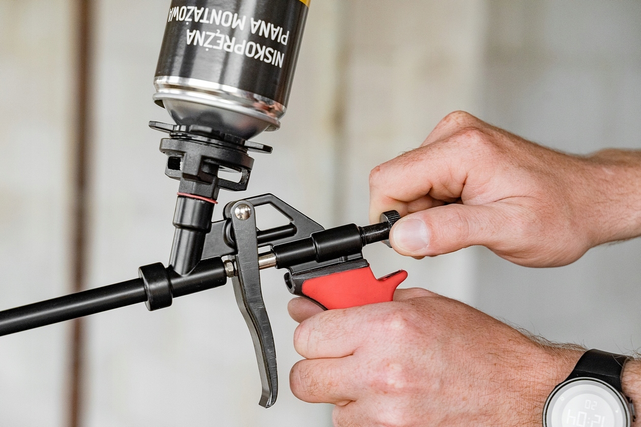 Встряхивайте баллончик с пеной около 30 секунд. Плотно вверните резьбу банки в гнездо пистолета. Нажмите на спусковой крючок, а затем отрегулируйте подачу пены с помощью регулировочного винта, расположенного на задней стороне пистолета. При более длительных перерывах каждый раз блокируйте пистолет с помощью регулировочного винта и встряхивайте пену перед следующим использованием.