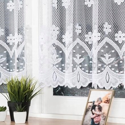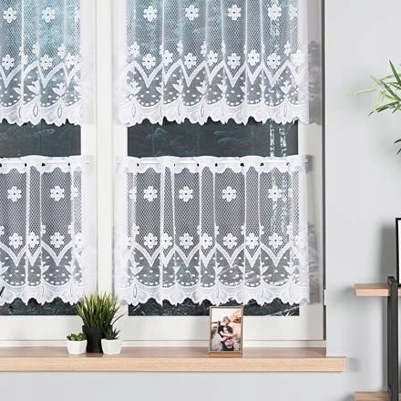 Нежная жаккардовая штора на метр, высота 40см белого цвета. В верхней части имеются отверстия для вставки палочки или палочки. Красивый узор с нежными цветами в стиле ретро.