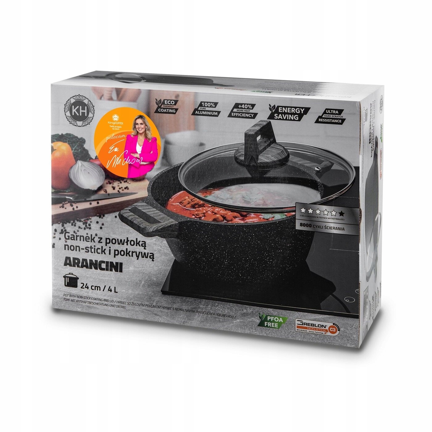 Мраморная индукционная кастрюля Konighoffer Arancini диаметром 24 см с крышкой изготовлена из алюминия. Для его создания использовалась технология гомогенного литья под давлением. Благодаря этому он идеально сбалансирован и очень прочен с точки зрения механических и термических свойств. Внутренняя часть кастрюли покрыта каменным антипригарным покрытием GREBLON C3. Его высокое качество, твердость и трехслойная структура разработаны немецкой компанией WEILBURGER. Он также имеет маркировку PFOA Free. Экономию энергии обеспечивает индукционное дно. Благодаря этому кастрюлю Arancini объемом 4,5 л можно использовать на любой плите. Гранитное антипригарное покрытие также позволяет жарить с небольшим количеством жира и упрощает уход. Она выдерживает до 8000 циклов истирания, что в четыре раза больше, чем у обычной посуды с антипригарным покрытием, доступной на рынке. Крышка с эффективным пароотводом позволяет тушить ингредиенты. Переносить и пользоваться моделью облегчают мягкие на ощупь ручки, которые не нагреваются, не выскальзывают из руки и имитируют своим видом дерево. С его помощью вы создадите свой собственный набор кухонной посуды из камня Аранчини – для домашнего использования. Продукт рекомендует Ева Вахович. Как амбассадор бренда Konighoffer, она горячо и с улыбкой рекомендует его для домашнего использования. Вместе с ним вы получите свой рецепт для дома. Это один из лучших вариантов в этой категории!