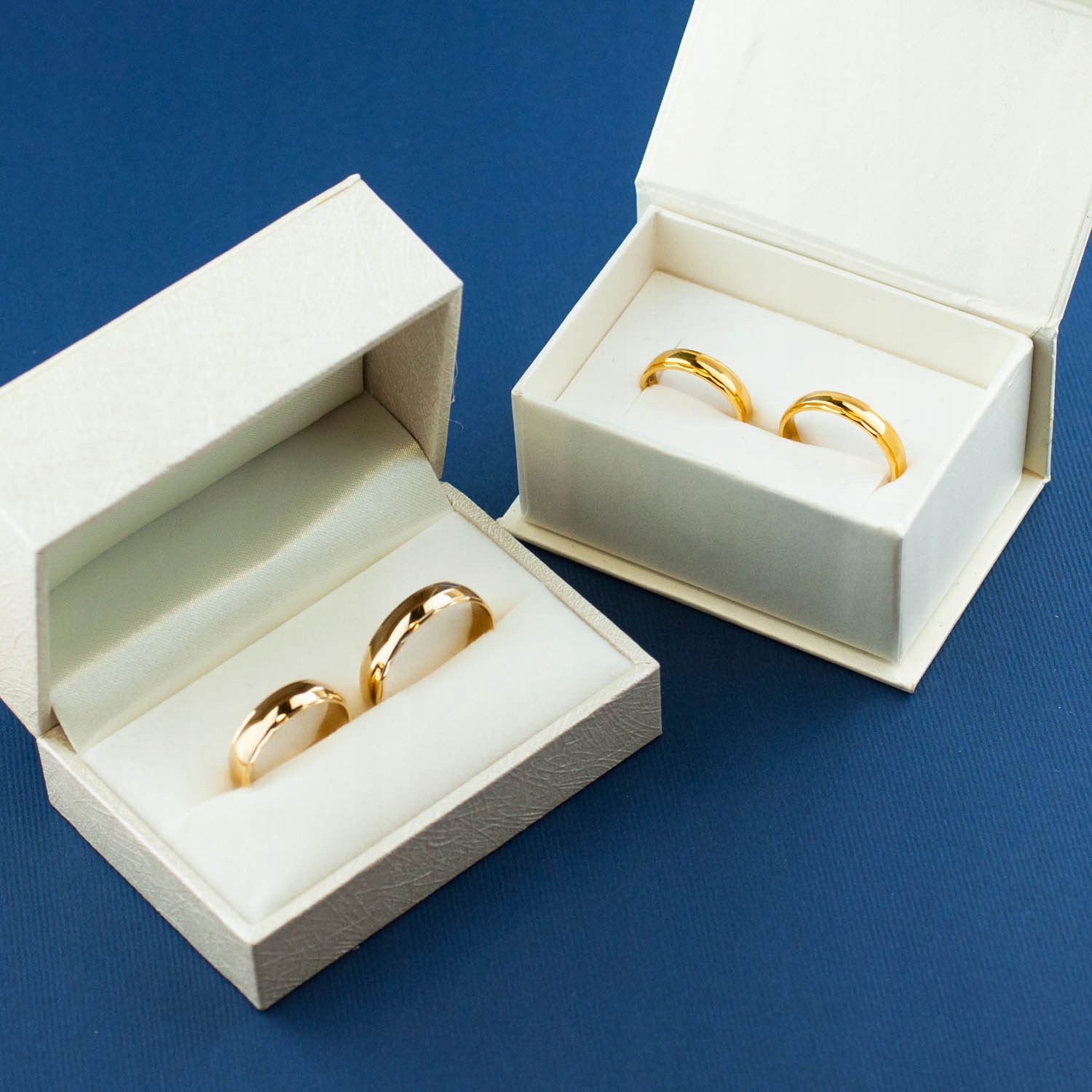 Обручальные кольца требуют уникальной оправы, поэтому мы совершенно бесплатно упакуем их в декоративную коробку цвета экрю, идеальную для подачи на свадебную церемонию. Крышка закрывается на магнит, а губка внутри коробочки облицована нежным белым материалом.